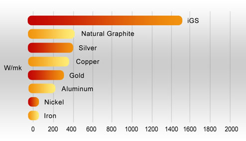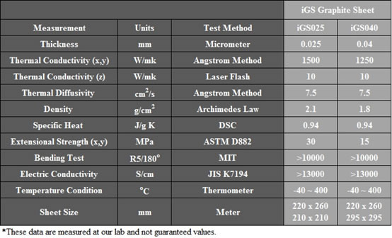 iGS (Intelligent Graphite Sheet) productsare able to dispatching heat effectively from a heat source to a heat sink. iGSgraphite sheets are provided with exerllent in-plane thermal conductivities,from 1400 - 1600 W/m-K, with good thermal shielding property which eliminateshot spots and prevents users from uncomfitable heat.