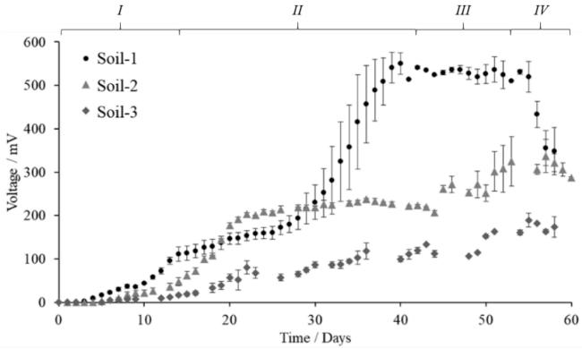 圖2 三種不同土壤環(huán)境中生物燃料電池輸出電壓的四個階段及變化對比