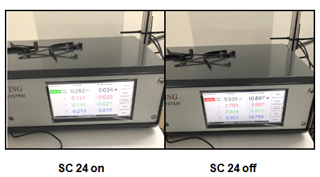 當(dāng)關(guān)閉SC24消磁器時,交流磁場AC為5.935 mG(X、Y、Z方向分別為2.703 mG、0.934 mG和5.201 mG)、直流磁場DC為10.897 mG(X、Y、Z方向分別為1.507 mG、0.911 mG和10.758 mG)。