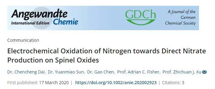 相關(guān)成果發(fā)表在Angewandte Chemie International Edition,Electrochemical Oxidation of Nitrogen towards Direct Nitrate Production on Spinel Oxides. Chencheng Dai, Yuanmiao Sun, Gao Chen, Adrian C. Fisher, Zhichuan J. Xu
