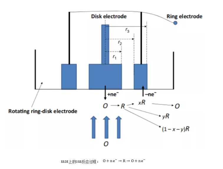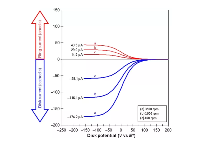在質(zhì)子交換膜燃料電池(PEMFC)中,陰極的ORR通常都是通過電催化來實現(xiàn)的。當ORR反應通過貴金屬或非貴金屬催化劑進行電催化時,都會產(chǎn)生副產(chǎn)物或中間產(chǎn)物,如過氧化氫。為了檢測過氧化物的產(chǎn)生量,可以通過RRDE收集實驗來探測電催化劑產(chǎn)生過氧化物的趨勢。在雙恒電位儀上測量圓盤電極極化曲線的同時,將環(huán)電壓設置為恒電位,控制圓環(huán)電極在固定的極化電勢,用以檢測圓盤電極上產(chǎn)生的反應中間物產(chǎn)率。