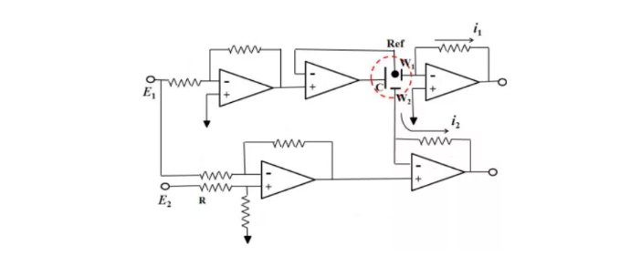 從結(jié)構(gòu)上說,雙恒電位儀并不是兩個恒電位儀的簡單疊加,下圖便是一個典型的具有多個運算放大器的雙恒電位儀的電路圖。E1為施加到工作電極1W1)上的電位,E2可以獨立的選擇電位。因此,工作電極2W2)可以被獨立的控制,通過這種方式,在RRDE應用中,我們就可以相對于同一參比電極對盤電極和環(huán)電極的電極電位分別進行控制。