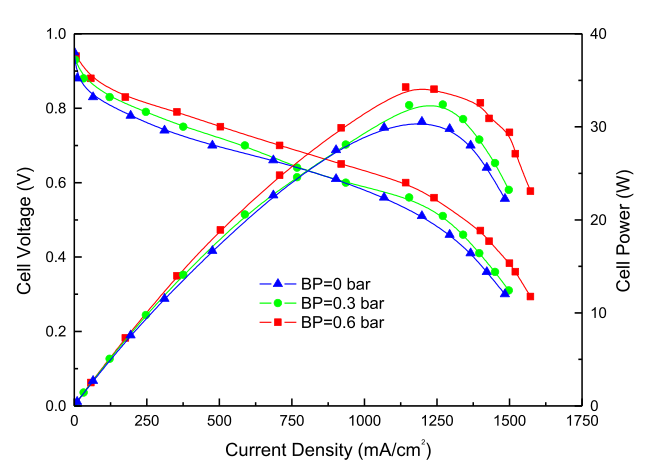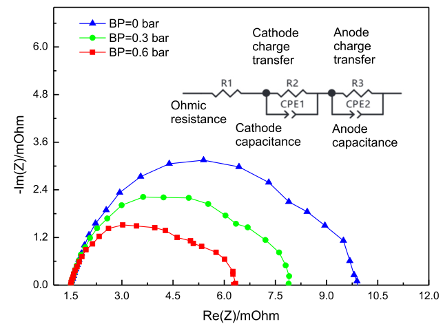 在較高的背壓下,使氣流飽和所需的水,比低背壓下所需的水少。證實(shí)了較高的背壓下,質(zhì)子膜的加濕性和導(dǎo)電性得到改善,從而降低了歐姆電阻和陰極電荷轉(zhuǎn)移電阻。