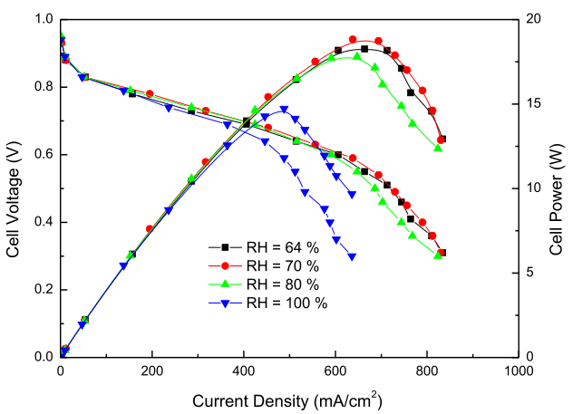 當(dāng)相對(duì)濕度從64%增加到70%時(shí),0.4 V電壓下的電流密度從764 mA/cm2增加到790 mA/cm2,在0.7 V電壓下,從405 mA/cm2到453 mA/cm2。