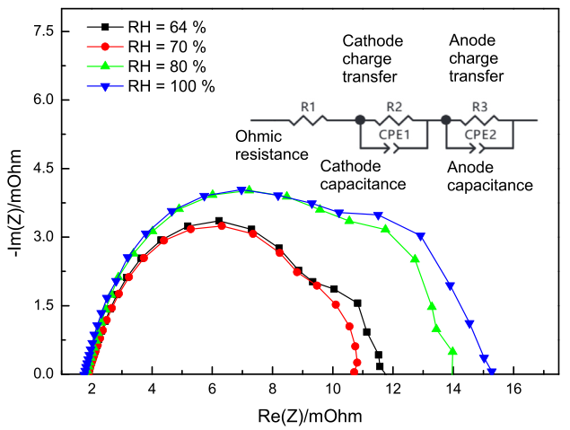 當(dāng)相對(duì)濕度從70%增加到100%時(shí),陰極和陽(yáng)極電荷轉(zhuǎn)移電阻急劇增加,造成PEMFC性能急劇下降。