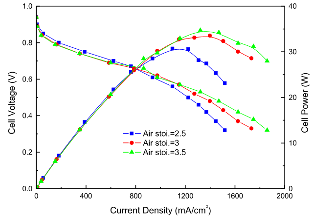 當(dāng)空氣化學(xué)計(jì)量從2.5變?yōu)?和3.5時(shí),0.7V電壓下的電流密度從621 mA/cm2變化到584 mA/cm2和598 mA/cm2,0.4V電壓下的電流密度從1417 mA/cm2增加到1564 mA/cm2和1686 mA/cm2。