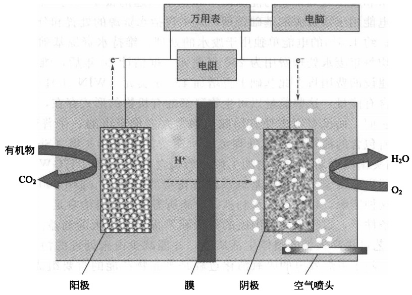 微生物燃料電池主要由陽極、陰極和質(zhì)子交換膜組成。陽極和陰極之間的質(zhì)子交換膜起到了隔離兩極溶液、傳遞離子的作用。在陽極區(qū)域,微生物通過代謝有機(jī)物質(zhì)產(chǎn)生電子和質(zhì)子,電子通過外電路,質(zhì)子則通過質(zhì)子交換膜傳遞到陰極。在陰極區(qū)域,電子和質(zhì)子結(jié)合氧氣生成水,從而形成整個(gè)電路回路。