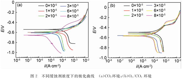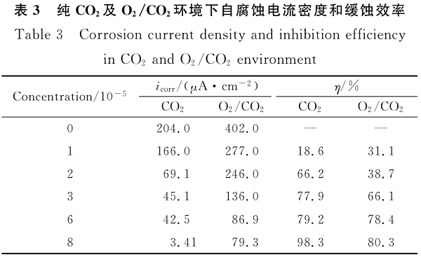 對(duì)比圖2(b)含氧環(huán)境下的極化曲線,發(fā)現(xiàn)隨著緩蝕劑濃度的增加,陰極Tafel斜率并無明顯改變,只是整個(gè)極化曲線向左平移,因此自腐蝕電流密度icorr減小的程度遠(yuǎn)不如純CO2條件下的明顯。