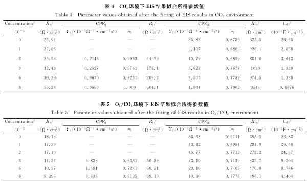 圖3為純CO2和O2/CO2環(huán)境下所測(cè)得的阻抗譜.由圖3可知,兩種條件下,不含緩蝕劑及含較低濃度緩蝕劑時(shí),阻抗譜由一個(gè)容抗弧構(gòu)成。當(dāng)緩蝕劑濃度增加時(shí),阻抗譜由雙容抗弧組成。在純CO2環(huán)境下,當(dāng)緩蝕劑達(dá)到8×10-5時(shí),低頻區(qū)還出現(xiàn)了一個(gè)小感抗弧,這是緩蝕劑吸附過程所致,而O2/CO2環(huán)境下則沒有出現(xiàn)。