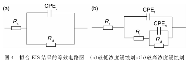 利用阻抗譜擬合軟件Zsimpwin進(jìn)行擬合,所得結(jié)果如圖4所示。緩蝕劑濃度較低時(shí),利用圖4(a)所示的等效電路進(jìn)行擬合,其中Rs為溶液電阻,CPE為常相位角元件,Rct為電荷轉(zhuǎn)移電阻。高緩蝕劑濃度時(shí),利用圖4(b)所示的等效電路進(jìn)行擬合,其中Rf為試樣表面各種物質(zhì)形成的膜的電阻,Rct為電荷轉(zhuǎn)移電阻。