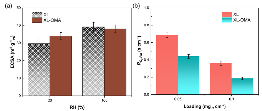 為驗(yàn)證OMA的效果,與標(biāo)準(zhǔn)商用XL膜進(jìn)行了對比,發(fā)現(xiàn)在不同濕度下,XL-OMA表現(xiàn)出了更高的電化學(xué)比表面積(ECSA)。同時(shí)在較低的Pt負(fù)載量下,XL-OMA表現(xiàn)出了更低的與壓力無關(guān)的02輸運(yùn)阻力,對OMA的氧氣運(yùn)輸表現(xiàn)出了積極影響,并且超低Pt負(fù)載,對質(zhì)量傳遞也起到了積極作用。