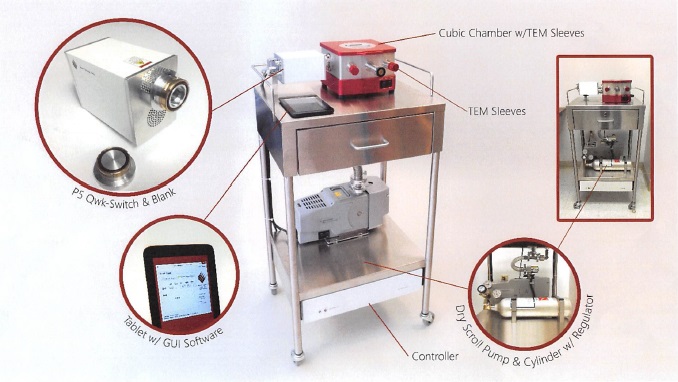 MCA腔室可容納需要去除碳氫污染的樣品,親水表面可儲存和清潔三個TEM樣品桿,帶有IBSS印記的GV10x順流等離子清洗器安裝在便攜式的不銹鋼推車上。