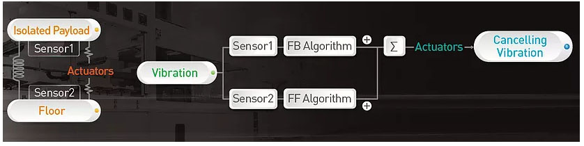 DVIA-MB使用反饋控制系統(tǒng)連續(xù)檢測干擾隔離有效負載基座的振動,并即時作出反應,以實時最小化振動。 DVIA-MB采用前饋系統(tǒng),以預定義的方式濾除地面振動。